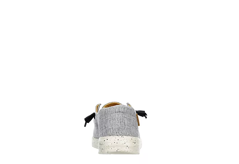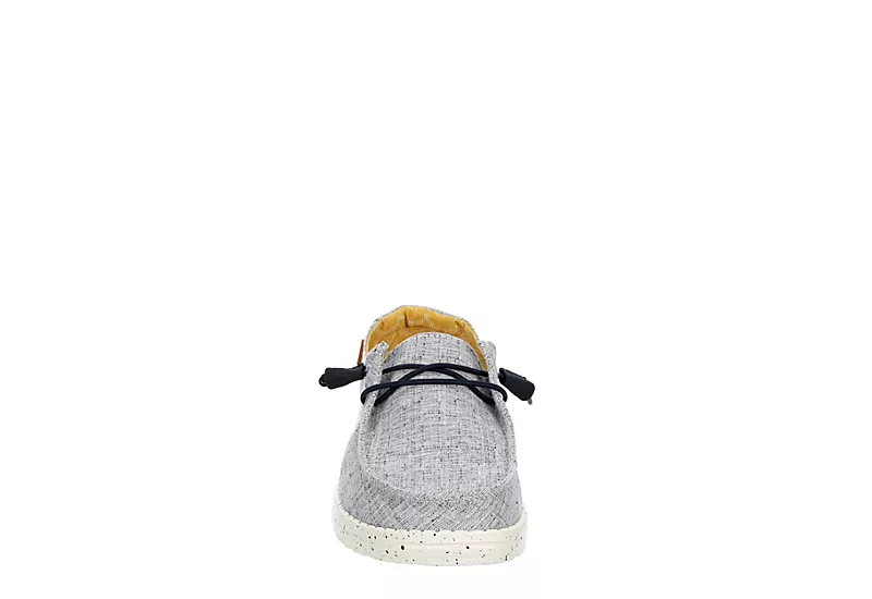 Relax into your passion with the HEYDUDE Wendy Chambray women’s slip-on sneaker. With a soft chambray canvas upper featuring elastic laces for a secure fit, this sneaker is machine washable for easy maintenance. The removable Memory Foam insole and leather lining offer ergonomic support and cushioning, while the ultralight outsole sets you free to explore unfettered.Â